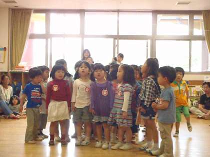 4歳児になると,恥ずかしいながらもみんなで歌を歌うのを聞いてもらうということを意識してできたり,お家の人にひっつかずに自分の遊びに向き合うことができるようになってきています。