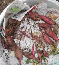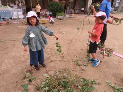 暑い夏を越した『サツマイモ』の収穫をしました。数は少なかったのですが、とてもきれいな色・形のお芋を、手で掘り出して、子どもたちは満足げでした。また『つる』も魅力的なおもちゃです。手や腕、指先を器用に使って『リース』作りも楽しみました。