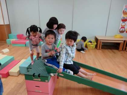 朝登園してきた子どもたちは保育室に滑り台があるのを見つけて早速遊び始めました。