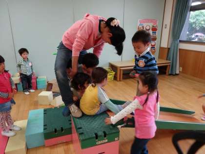 3歳児のたんぽぽ組の先生は,雨でも楽しんで遊べるようにと保育室に巧技台の滑り台を持ってきました。