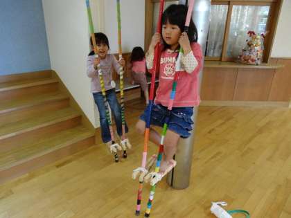 そんな子どもが日に日に増え,幼稚園中で竹馬の練習をしています。