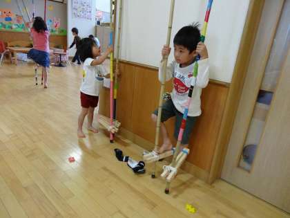 5歳児のゆり組は,毎年6月の休日参観でお家の方に竹馬をつくってもらっていました。