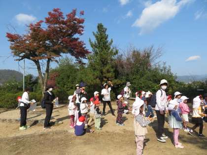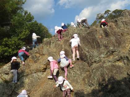 街中にありながら、子どもたちは『忍者がいるかも』『ようせいさんのいえがあるかも」とファンタジーの世界もふくらませ、坂道や崖道を思いきり駆け回り、たのしい半日をすごしました。そして大文字山にのぼった5歳児のお兄さんお姉さんへの思いをもち、大きな声で『やっほ!ゆりくみさん!』と声をかけたり、光(鏡)の交信をしたり、幼稚園の『なかま』意識も盛り上がっていました。