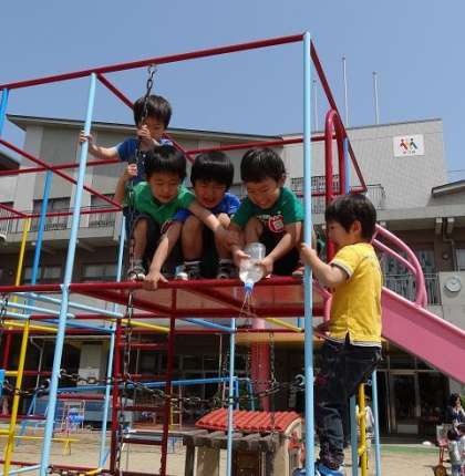 4歳児のばら組はさっそく水遊びです。