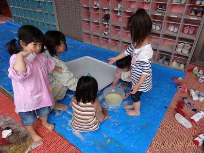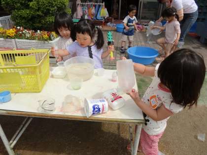えっ,もう?!と先生方に尋ねてみると,色水が嬉しくて,粉の中にじゃばじゃばと全部入れてしまって,とろとろを通り越してしゃばしゃばにしまい,水遊びになってしまったのだそうです。