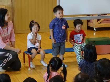 3歳児のときには名前を呼ばれてもはずかしくて出て来れなかったり,走り回って椅子に座ってられなかったりした子どもも,4歳児になると「はい!」と返事をして前に出てきたり,落ち着いて受け答えしたりできるようになる姿がたくさん見られます。