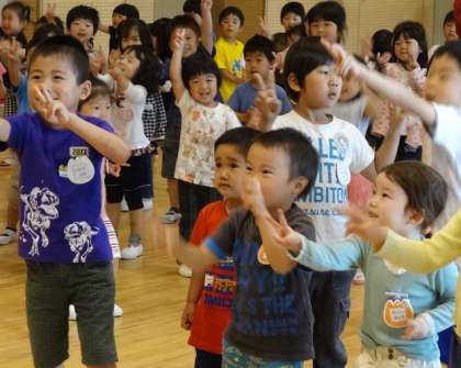 みんなでリズムにのって踊り,最後のこちょこちょのしあいっこのところでは『くるぞ〜くるぞ〜』とドキドキしながら待っていたり,遊戯室中を走り回って逃げたりして楽しみました。
