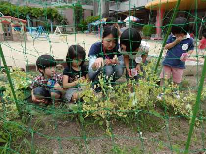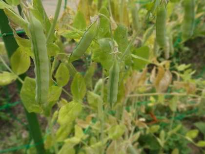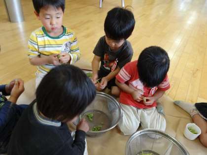 もうしばらくすると,職員室にざるに入ったエンドウマメを持ってきて