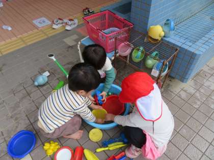 入園したばかりの3歳児。まだ不安な気持ちもありますが、先生と一緒に木の板で作った滑り台で遊び始めました。滑ったり登ったり何度も繰り返すことが面白いようです。保育室の前で水におもちゃを入れていると…1人、2人、3人とタライを囲む人数が増えていきます。“なんだか楽しそうだな”と心が動くと、しぜんと体が動き出します。幼稚園で楽しそうなこと、いっぱい見つけようね!