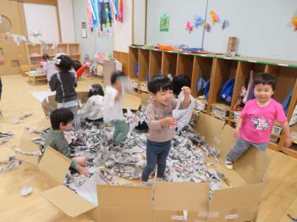 3歳児もも組の中に新聞プールができています。びりびり破いたり、先生にかけてみたり…楽しそうな様子を見て、どんどん子どもたちが集まってきました。先生を核に“みんながいる遊び場”ができています。雨で外に出られなくても、心と体をいっぱい動かして楽しんでいます。