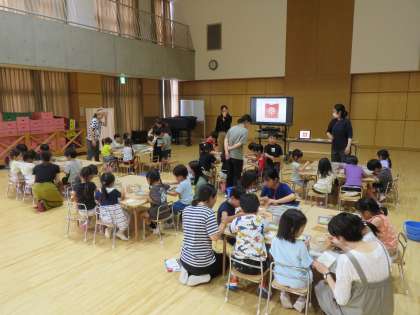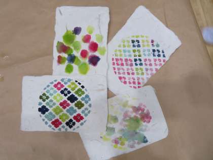 年長児ゆり組の子どもたちが、和紙はがきの型染体験をしました。『株式会社和える』より井寺 美樹先生が講師として幼稚園まで来てくださいました。自分なりに「こだわり」をもって色や型を選び、じっくり取り組む姿は、本当に職人さんのようです。色の変化や形の面白さに気づき、顔料や和紙の材料にまで興味が広がっていました。できたはがきは「お家の人に見せよう!」と大事に持って帰っています。三洋化成工業株式会社様からのご寄付により、素敵な伝統文化体験をさせていただけました。ありがとうございました。
