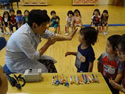 眼科の園医さんは,子どもが怖がったりしないように,毎年楽しいグッズを持ってきてくださいます。