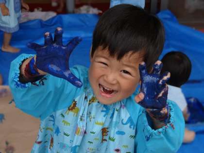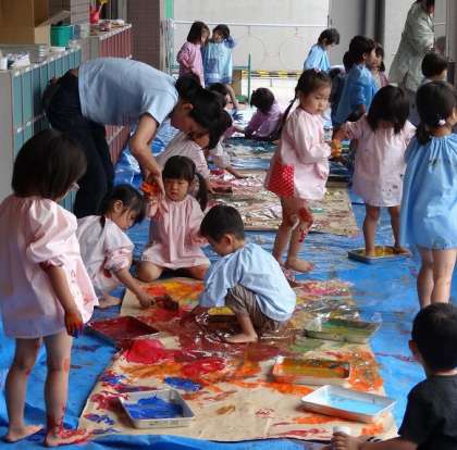 3歳児のもも組とたんぽぽ組は,2クラス一緒に絵の具遊びをしています。
