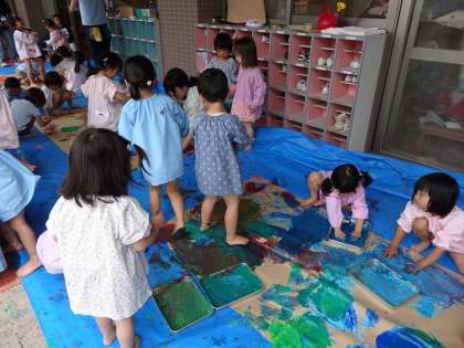 もくもくとぬりぬりぬりぬりと遊んでいる子どもやいろいろな絵の具の色を試している子どもや,手についたどろどろ絵の具を「見て見て」と見せてくれる子どもや,足にもつけてつるつるすべっている子どもなど,楽しみ方はそれぞれです。