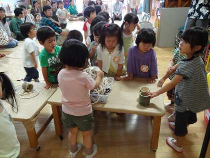 幼稚園の中を案内したり,自分の持ち物や植木鉢を見せてあげている子どももいました。