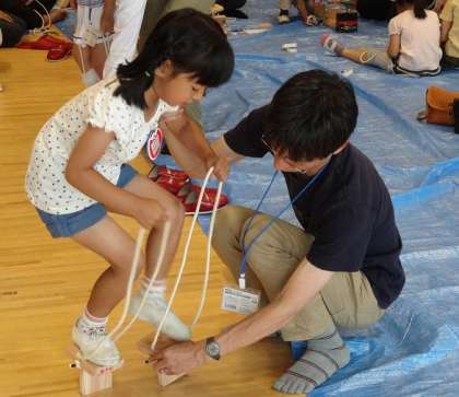 昨年度一緒につくっていただいた竹ぽっくりでいっぱい遊んできましたが,今度は少し難しくなりますね。