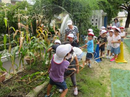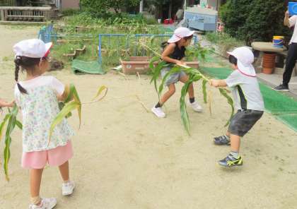 年長児が畑のポップコーンを収穫しました。大きく育ったポップコーン、思いきり引っ張ってみましたが…抜けません。友達と一緒に引っ張ると…!抜けました!根っこもとてもしっかりしていて強そうです。最近、“綱引き”や“棒引き”の遊びを楽しみ始めている年長児。形を見て、ひらめいた!今日は“ポップコーン引き”が始まりました。