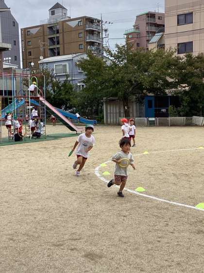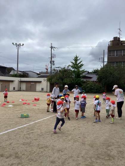 「年少さんのダンス、みんなで踊ろう!」と踊った後は、全学年が入り混じってのリレー大会!子どもも先生も一緒になって走ります。「ぼくたちもやってみたい!」憧れて見ていたのです。まだまだ、子どもたちの心と体が動く“運動会”が続きそうです。