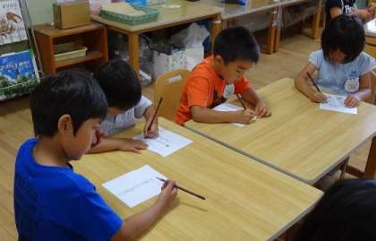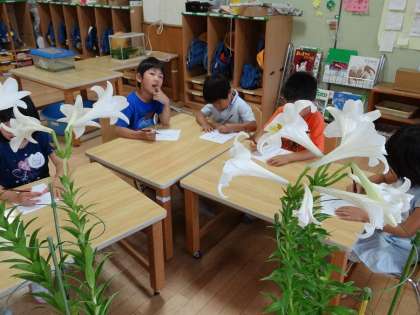 5歳児のゆり組は,保育室にゆりの鉢植えをもってきて絵をかいていました。