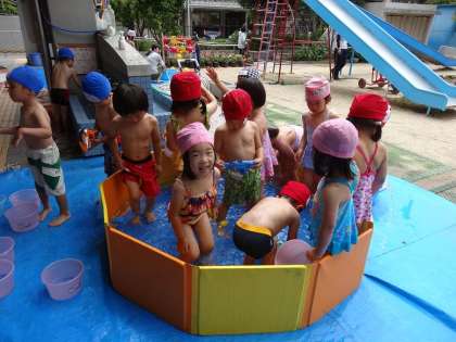 ビニールプールにたくさんの子どもが入り,いものこを洗うようです。