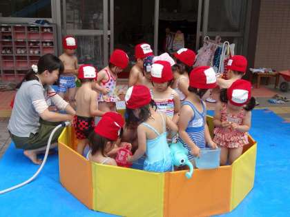 6月中はテラス前の水遊びで水に親しみ,水遊び大好き!になって,屋上のプールを楽しみにできるようにしたいと思います。