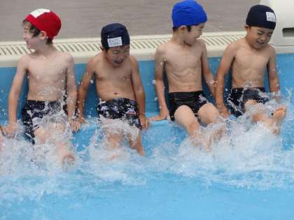 後半は好きな道具を使って,大小両方のプールを使って,自由に遊んでいいよということで,おおはしゃぎです。
