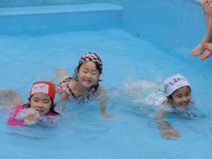 5歳児のゆり組は,少しずつ水に入り,おへそに水をかけ,おなかに水をかけ,肩にかけ,プールの段に腰掛けてバタ足をし,寝そべってバタ足をし,プールの端から端まで好きな泳ぎ方や歩き方で往復したりしながら,水温に慣れ,水遊びを思い出していました。