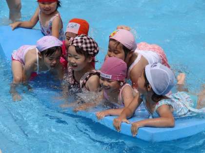大きなビート板に友達と乗って水しぶきをあびて遊んだり,友達の手をとって泳がせてあげたり,友達と泳ぎっこをしたりして楽しんでいました。