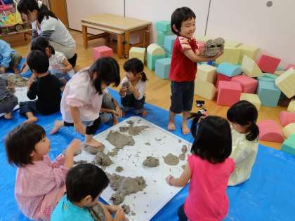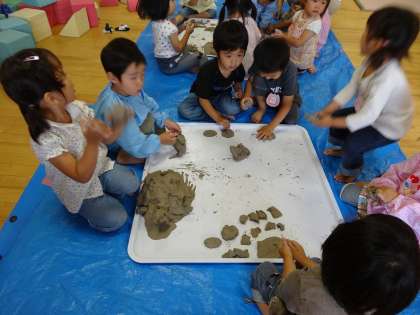 3歳児のもも組の保育室では,土粘土遊びをしています。
