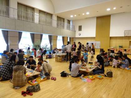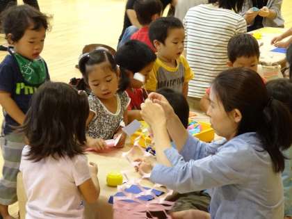 遊戯室に集まって,先生から話を聞き,親子で思い思いの飾りをつくりました。