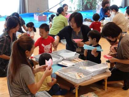 前で先生が編紙や天の川等の作り方を説明するのを必死で聞いて,やってみておられました。