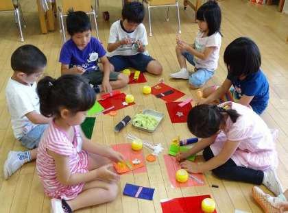 5歳児になると,自分で上手にのりやはさみを使って製作していきます。