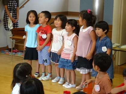 ゆり組の当番の子どもが前に出てきて,カレーに入っている材料を教えてくれました。