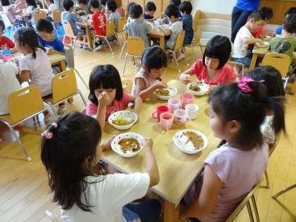 4歳児のばら組と3歳児のもも組・たんぽぽ組は自分たちも手伝った満足感と,ゆり組へのあこがれをもったカレーパーティーでした。