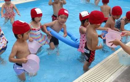 3歳児の子どもたちが,そろそろプールからあがる時間が近づいてきました。