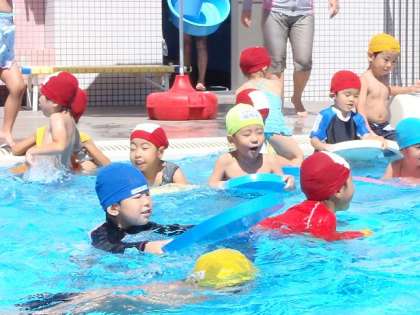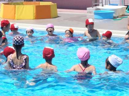 4歳児のばら組と5歳児のゆり組が入っている大きなプールには,水がなみなみと入っています。