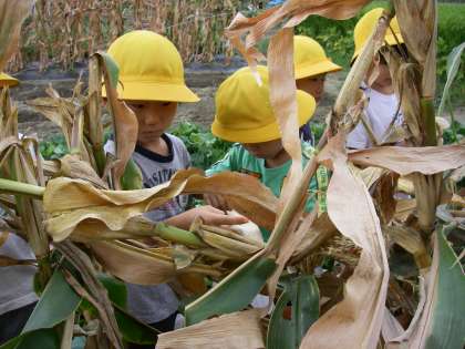 子どもたちは,何回も畑には行っているのでバスを降りてから「もう少しでつくな」と言いながら歩いていきました。畑について長靴に履き替え,畑の探検をしていよいよポップコーンの収穫です。どれがポップコーンなのか探しました。すぐにわかった子どもたちもいましたが,中には,「どこにあるの?」と白くふわっとしたいつも「ポップコーン」といって食べているそのものを探していた子どももいて「これがポップコーンなん?」と不思議そうに見ている人もいました。初めての経験することだからそんなこともあるよね・・と思いました。一つ見つけると次々に見つけて,袋の中に入れていきました。