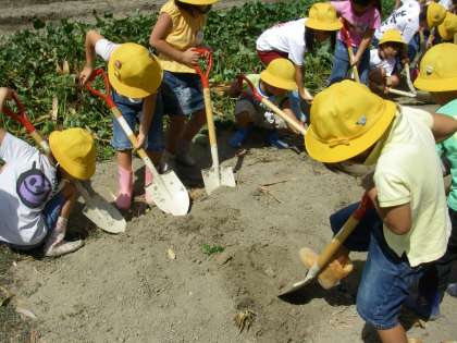 抜いた後は,食育・農園班のお母さん先生や地域のおじさん先生が,切ったり,折ったりして小さくしてくださいました。子どもたちは,抜き終わった畑に種を蒔けるように土を耕しました。そして,大根とブロッコリーの種を蒔いて帰ってきました。