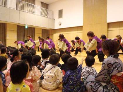 第1部の各保育室での遊びコーナーや遊戯室での昔遊びコーナーでは,子どもたちの笑顔がいっぱい見られました。2部の佛教大学のよさこいサークルの学生さんたちによる踊りは,リズミカルで迫力があり,気持ちが高まるようでした。後半は,子どもたちと一緒に踊る曲もあり心も体もわくわくした時間でした。