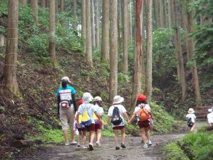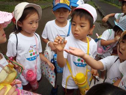 さあ,帰る時間です。雨上がりの山の自然も素敵です。帰り道,あちこちで子どもたちの歓声が聞こえてきます。透きとおった羽がきれいな蝉を発見。それから,カマキリの子どもも発見。宿泊等へ向かう帰り道は子どもにとって山の自然を満喫したときとなりました。夜は,キャンプファイヤーをするので,雨は降らないでね!!