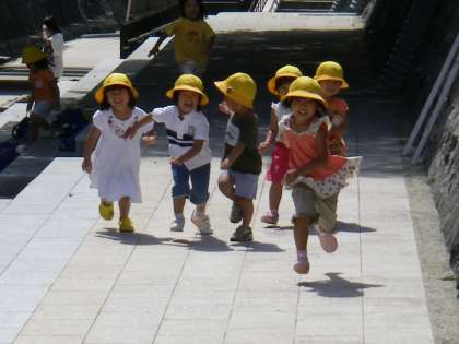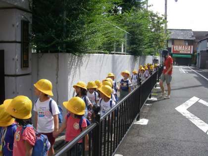 7月にお家の人と一緒に出かけた近くの堀川に行きました。たんぽぽ組・もも組だけで手をつないで堀川まで歩きました。道は車がよく通るのですが,路側帯の中や道のはしっこをとても上手に歩いていくことが出来ました。お家が一緒の方向のお母さんたちは少し離れた所から見守ってくださっていました。