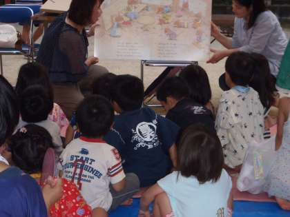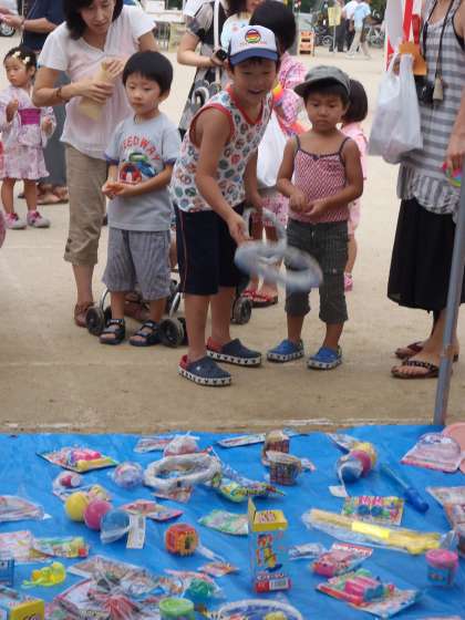 新町小学校で行われた中立ふれあい広場。みつば幼稚園のPTAの役委員さんは,輪投げのコーナーを,先生たちは,紙芝居コーナーを担当しました。輪投げコーナーは,素敵な景品がいっぱい並べられ,たくさんの子どもたちで大盛況でした。