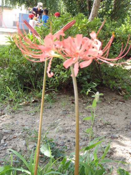 始業式が終わり,園庭で遊んでいるとき「先生,こっち来て,これ見て〜」と声をかけられました。そこには,ひがん花が可憐に咲いていました。また,空を見上げるとざくろの実がたわわになっていました。いろいろな発見をしている子どもたち。秋が近づいているのを感じながら,なんだか心が和んだひと時でした。
