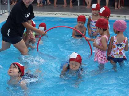 シャワーも頭からかかることができるようになったり,水の中で,先生や友達と体を触れ合って楽しんだり,“やってみよう”と心が動いたりなど,子どもたちの笑顔が輝いたプール遊びでした。