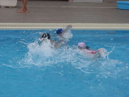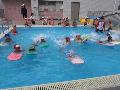 4歳児は,大きなプール(昨年までは,小プールで遊んでいました)に入って随分水に慣れ,自分のしたい遊びができるようになってきました。私が見ていると,「見てて〜。」と顔をつけたり,ぶくぶくともぐったりします。また,体を伸ばしてふんわり浮くなどそれぞれが自分なりの楽しみ方でプール遊びをしているようでした。来年は,どのような姿を見せてくれるのでしょう。