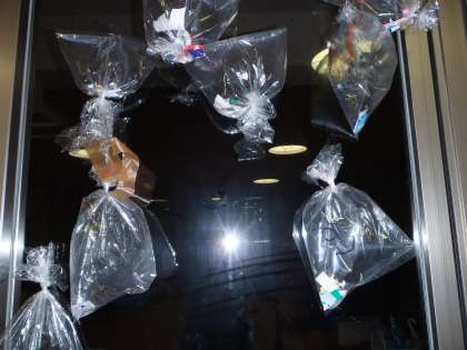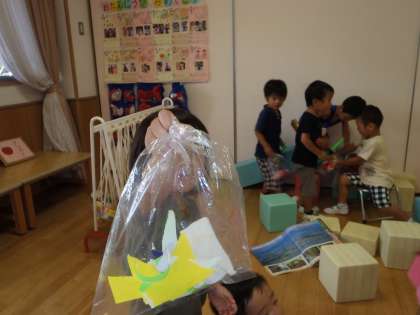 3歳児(もも・たんぽぽ組)の子どもたちは,今,怪獣やおばけの世界で遊んでいます。そんな子どもたちの姿から,先生たちは「おばけをつくろう・・・」と考えました。さて,材料は,透明なビニール袋・光った紙・色紙・モール・ユリテープなどが保育室に用意されました。子どもたちは,ビニール袋に好きな材料を入れていきます。ビニール袋を動かすと,中にはいている紙が動いてとても,楽しい気分になったようです。友達がつくる様子を見て,「つくってみたいな〜」とたくさんの子どもたちがおばけつくりをたのしみました。顔や,手をつくった子どももいます。おばけがいっぱいの保育室に変身しました。さて,子どもたちが帰ってから,先生たちは,明日も楽しんで遊べるように,環境を整えています。素敵な保育室になっています。明日の遊びがどんな風になっていくのか楽しみです。