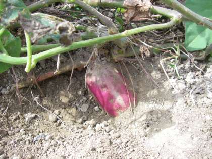 サツマイモも葉っぱの茂り具合があまりよくなくて,どうなっているかと心配だったので少し覗いてみました。中からはいい色をしたおいもが出てきました。たくさんできているといいですね。運動会が終わると収穫に行きます。全園児で楽しみたいと思っています。