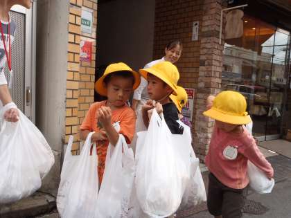 さあ,11時。パンを買いに出発!。お店に着くと,「みつば幼稚園です。パンを買いに来ました」と挨拶をしてお店の人からパンをもらいます。袋の中は,パンがいっぱい入っています。重たいけれど,待っている子どもたちのために頑張って持って帰ります。