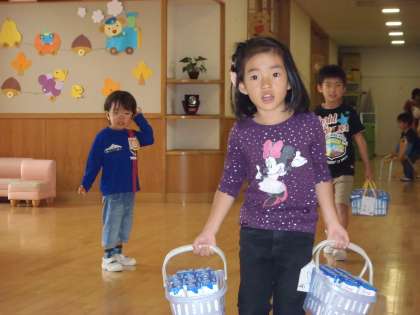 幼稚園に到着すると,パンや牛乳を数えて各クラスに配ります。お味噌汁も出来上がり,食べる準備ができました。お当番の皆さん,ありがとうございました。
