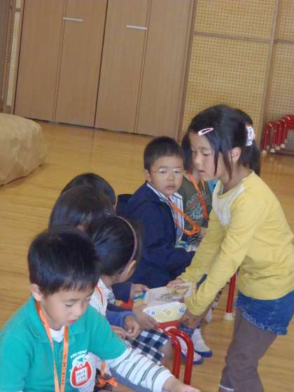 かわいいおサルさんから,松ぼっくりの首飾りをもらいました。幼稚園からのプレゼントは,年長児が渡してくれました。それから,遊戯室に大きな畑が出てきておじいさんの登場です。お芋のつるが伸びています。おじいさんとおばあさんが,つるを引っ張るのですが,なかなかお芋は出てきません。困った二人は,10月生まれの子どもたちを呼ぶことにしました。みんなが気持ちを合わせて,「うんとこしょ・どっこいしょ」と力いっぱい引っ張ると,なんとなんと大きなおいもが出てきました。「あ〜,良かった」